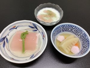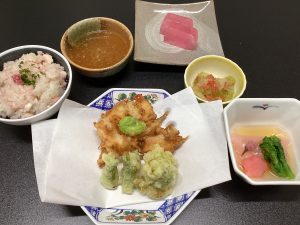 新玉ねぎ、そら豆、ズワイガニはかき揚げに、たらの芽やふきのとうは天ぷらに仕上げました。桜流しは淡いピンク色で華やかさを添え、ふんわりとした桜の香りもお楽しみいただけました。桜鯛を使った桜御飯や天ぷらは特に好評で、「美味しかった」とのお声も多く聞かれました。