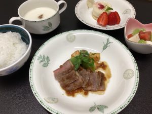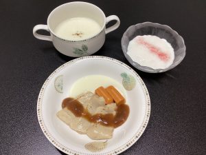 軟らかく飲み込みやすいお食事は、やわらかステーキ、新玉葱のポタージュ、レアチーズムースをお出ししました。