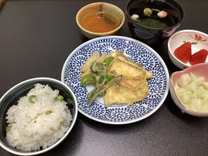 4月8日、お釈迦様の誕生を祝う花まつりの昼食には、豆ごはん、天ぷら、長芋の木の芽和、おすまし、いちごをご用意。「豆ごはんね」と笑顔がみられ、鯛と新玉ねぎやこごみなど春野菜の天ぷらと、楽しく召しあがられている様子でした。